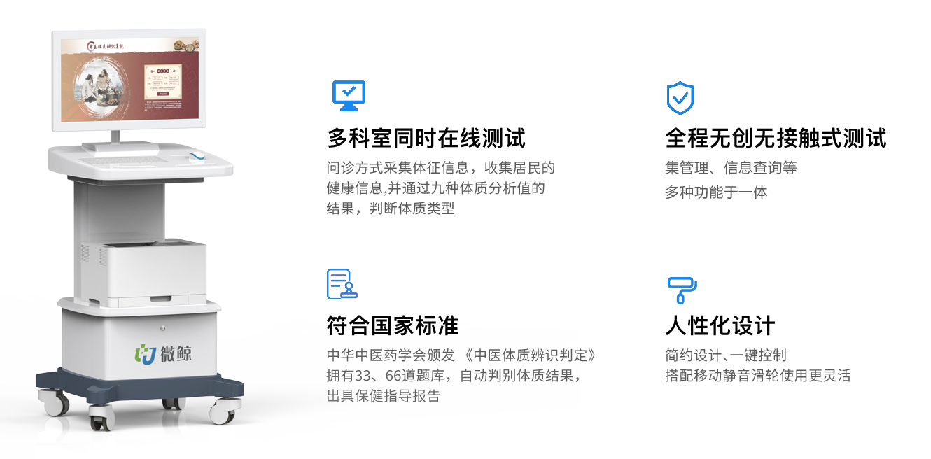 中医体质辨识仪具备智能判断和生成报告功能,支持无接触体质检测。采用ABS医用环保材料制造,配备医用级静音轮,便于轻松移动。设备具备体质采集管理、数据查询、筛选和统计功能。